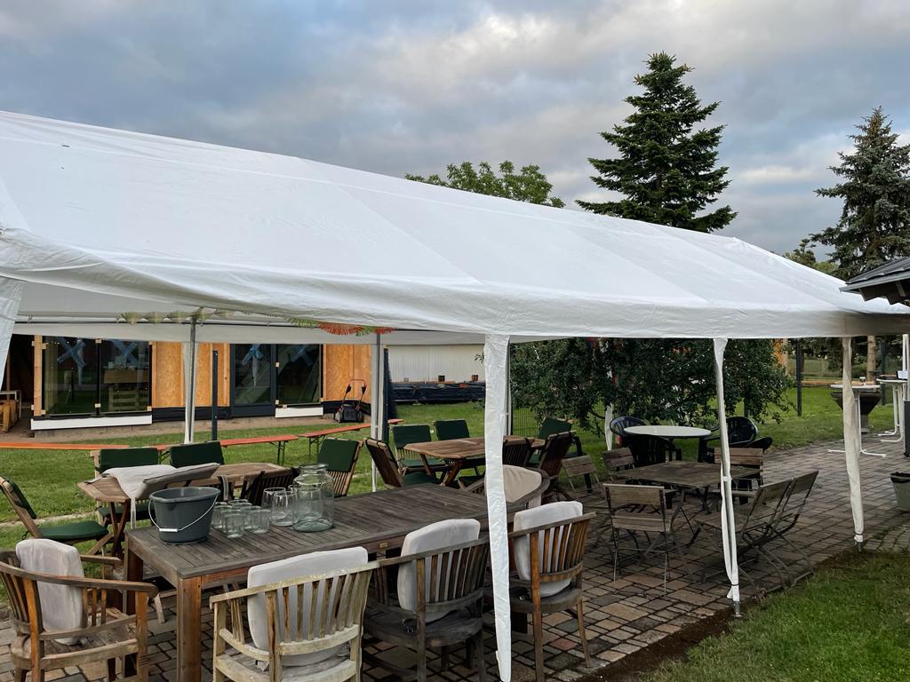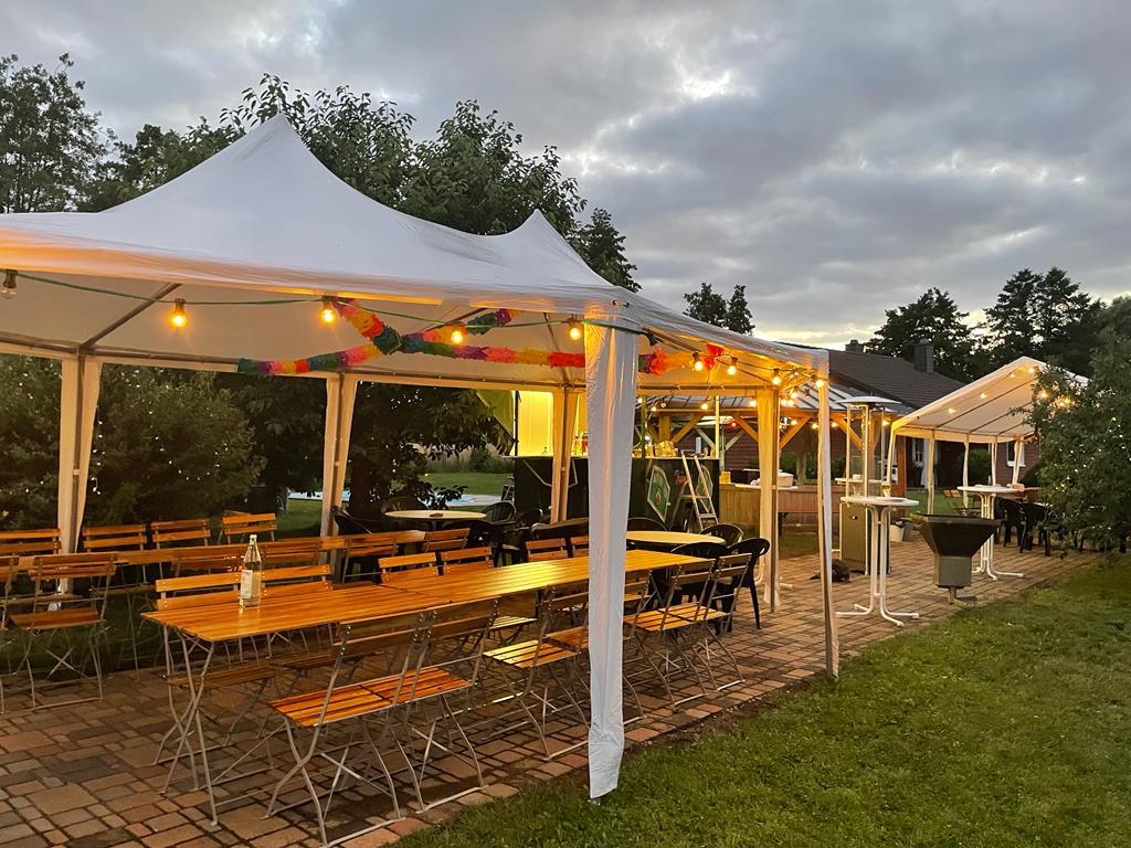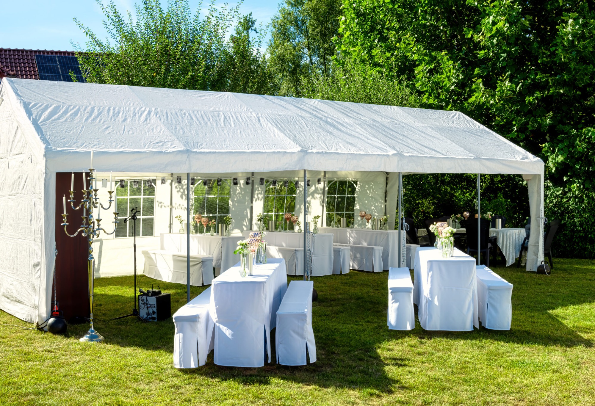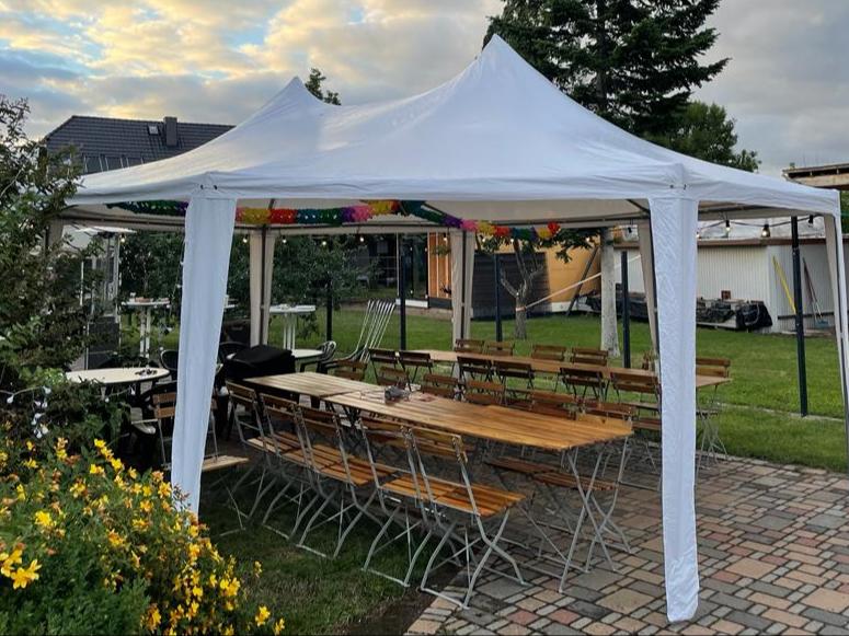 Unser 4×8 m Zelt bietet 32 m² überdachte Fläche – ideal für kleinere Feiern, Gartenpartys, Vereinsveranstaltungen oder als Überdachung bei Promotion- oder Catering-Einsätzen. Je nach Bestuhlung finden darin 30 bis 45 Personen bequem Platz.